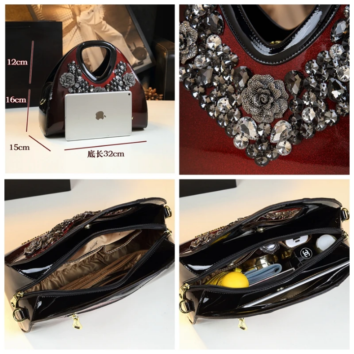 MADE WITH 100% HIGH QUALITY LEATHER MATERIALS, WITH A NONE FADING, NON TARNISHING OR DIMINISHING GOLD HANDLE. HIGH SENSE PATENT LEATHER.